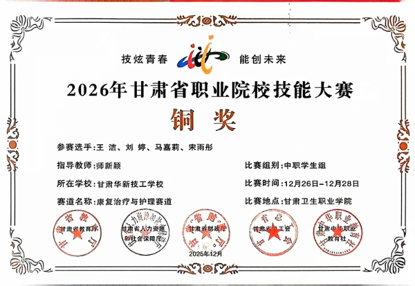 2026年甘肃省职业院校技能大赛以"技炫青春,能创未来"为主题,吸引了全省多所职业院校参赛。在激烈的"康复治疗与护理"赛道中职赛项中,甘肃华新技工学校派出两支优秀队伍参赛,经过多轮比拼,二队"医路向前队"凭借扎实的专业知识和出色的实操技能,最终荣获铜奖殊荣。